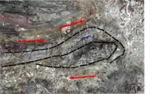 A drag fold formed by upper layer moving right, lower layer moving left. The middle layer is dragged and rolled over, forming a drag fold. Red arrows showed the direction of motion of the upper layer and the lower layer. (Photo took in Nai Chung)