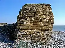 Wales' many fine cathedrals, abbeys and castles have used a variety of stones in their construction; Caerbwdi Sandstone in St David's Cathedral, Old Red Sandstone at Llanthony Priory and Tintern Abbey, 'Blue Pennant' sandstone in Caerphilly Castle and Sudbrook Sandstone at Caldicot Castle to name but a few. Triassic rocks provided the Radyr stone and also the Quarella stone which was worked at Bridgend.[9] Sutton Stone from South Wales' Jurassic outcrop is a highly regarded limestone freestone that has been used in construction throughout the Vale of Glamorgan, it was also shipped over the Bristol Channel to North Devon and North Cornwall which are both deficient in limestone.