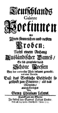 - ↑ See title page (in German) at File:Galante Poetinnen 0002 (Wikimedia Commons)