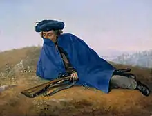 Kersting's most lasting works are his figures in interiors that borrow from seventeenth-century Dutch genre painting. These paintings nevertheless feel contemporary due to the situations depicted and the effect of the artist's personality.[5] The characters are often viewed from the back, as in Friedrich's work, and the scenes provide hints of narrative as the figures engage privately in everyday activities. A number of his works refer to his time in the volunteer corps, the "Lützow rangers". He drew a full-length self-portrait in 1813, in which he wore the rangers' uniform. The painting On Sentry Duty (1815) depicts three rangers, including the artist Ferdinand Hartmann and the writer Theodor Körner, who fought with Kersting and died in wars against the French.