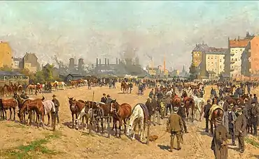 In 1874, he had his debut at an Academy exhibition, where he presented his "Forest Hunting Party with Deer". After completing his studies, he produced panoramas and dioramas of Berlin, Leipzig, Dresden and some cities in the United States. Soon, however, he turned to animal painting; primarily focused on horses, presented in a variety of contexts, although a majority of these works are hunting or battle scenes. He also created lithographs and wood cuts.