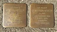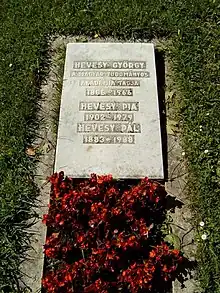 De Hevesy married Pia Riis in 1924. They had one son and three daughters together, one of whom (Eugenie) married a grandson of the Swedish Nobel laureate Svante Arrhenius.[16] De Hevesy died in 1966 at the age of eighty and was buried in Freiburg. In 2000, his body was moved to the Kerepesi Cemetery in Budapest, Hungary. He had published a total of 397 scientific documents, one of which was the Becquerel-Curie Memorial Lecture, in which he had reminisced about the careers of pioneers of radiochemistry.[17] At his family's request, his ashes were interred at his birthplace in Budapest on 19 April 2001.