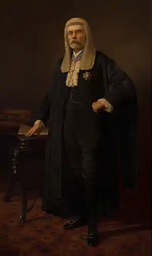 1905 Group portrait of the Full Court consisting of Sir Samuel Way, Sir James Boucaut, and Sir Henry Bundey with the master, A. Buchanan in the foreground, hung in the foyer of the Supreme Court of South Australia[24]