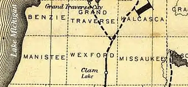 When they came to the area between Little Clam Lake and Big Clam Lake, Mitchell persuaded Innes that the original route layout between the lakes should be redirected to run to the eastern end of the Little Clam Lake in the southeast corner of Wexford County, Michigan. He wanted the railroad route to run there because he was planning the development of a new town, Clam Lake (early Cadillac). The railroad, and the lumber business he envisioned, was to be an important part of the village's development.[7][1] Mitchell would later have the Clam Lake Canal dug, connecting the two lakes and allowing for logs to be floated across them.[7]