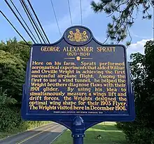 The Pennsylvania Historical and Museum Commission dedicated a state historical marker to Spratt on October 16, 2021. Located by the road outside the Spratt Farm in West Brandywine Township, Chester County, Pennsylvania, the marker states that his "research was instrumental in the Wright brothers’ first flight. He performed countless experiments to understand the forces that would keep aircraft aloft. His innovative use of a wind tunnel led to greater understanding of the effect of lift, drag, and the center of pressure on a curved wing.”[7]