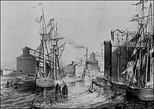 Through the 1830s sacks or barrels or even buckets of grain were hoisted off vessels and into warehouses by manpower – sometimes even using bucket brigades.[35][36] The amounts of grain being moved in a contract were measured in the thousands of bushels. By the 1840s, a certain amount of bulk transport was taking place and grain was stored in individual bins according to source in warehouses and the heavy lifting was done by block and tackle pulled by horses. By 1848, the horse was replaced by a steam engine, but not the block and tackle. The amounts being moved were in the tens of thousands of bushels.[37] If the transport of grain was to move into the hundreds of thousands of bushels then changes were needed.[38]