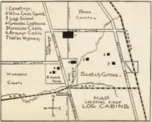 Map locating first cabins Argyle, IL – includes location of cabin belonging to John and George Armour – circa 1830s [3]
