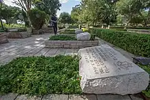 Beurling's coffin was kept for three months in a warehouse in the Verano Monumental Cemetery, as nobody had claimed the body. Then his widow, Diana Whittall Gardner, had him buried in the Cimitero Acattolico behind the Cestia Pyramid, between the graves of Percy Bysshe Shelley and John Keats. In November 1950, two and half years after his death, Beurling's casket arrived at Haifa Airport. His coffin, draped with the blue and white Israeli flag, was laid in a nearby air force base, where an honour guard of young airmen mounted a silent watch. During the long funeral in the streets of Haifa, Israeli Air Force aircraft paid homage to Beurling. At last, he was re-interred in the military cemetery at the foot of Mount Carmel. The grave is marked, as are the others in Israel Defense Forces cemeteries, with only name, serial number and rank: for Beurling that of segen (lieutenant).[56]
