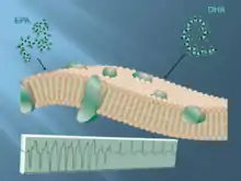 The same effect has been shown to occur in humans by other researchers. Billman's more recent work has focused on discovering the biochemical mechanisms of the antiarrhythmic effects omega-3 fatty acids, and on whether the same protection can be gained through dietary omega-3 fatty acids.[20] A 2003 review of the research suggested the effect was due to electrophysiological properties of free omega-3s in sarcolemma. Dietary fatty acids are incorporated into membrane phospholipids and are then released during ischemia, suggesting a possible mechanism whereby the cardiac muscle is more resistant to entering arrhythmia under stress.[10] However, large-scale clinical trials of dietary omega-3s have been inconclusive, with some studies finding significant reduction in sudden cardiac death and others finding no effect. Meta-analysis performed in 2014, found statistically significant reduction in sudden cardiac death (odds ratio (OR) 0.86; confidence interval (CI) 0.76 to 0.98), while 2013 meta-analysis using a different data set found a non-statistically significant reduction (OR 0.82; CI 0.60 to 1.21).[21][22]