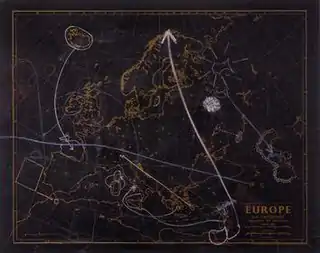 For the exhibition, the white chair was spot-lit in the middle of the gallery with a stack of Three Chair Events scores placed nearby on a window sill. The black chair was placed in the bathroom, whilst the yellow chair was placed outside on the street, and was being sat on by Claes Oldenburg's mother – deep in conversation – when Brecht arrived for the private view.[32] A later piece, Chair With A History, 1966, part of a series Brecht worked on in Rome, featured a chair with a red book placed on it inviting the occupier to add 'whatever was happening' as part of an ongoing record of the chair's history.[1] Other series of works included signs, often readymade, with simple statements on, such as 'Exit' or 'Notice Green' embossed in a red sign next to 'Notice Red' embossed on a green one.
