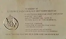 Butterworth's body was never recovered (although his unidentified remains may well lie at nearby Pozières Memorial, a Commonwealth War Graves Commission cemetery), and his name appears on the Thiepval Memorial.[2] George Butterworth's The Banks of Green Willow has become synonymous for some with the sacrifice of his generation and has been seen by some as an anthem for all 'Unknown Soldiers'. Sir Alexander Butterworth erected a plaque at St Mary's Priory Church, Deerhurst, Gloucestershire in memory of his son and of his nephew, Hugh, who died at Loos in 1915. (The Rev. George Butterworth, the composer's grandfather, had been vicar of St Mary's in the previous century.[2]) Sir Alexander also arranged the printing in 1918 of a memorial volume in his son's memory. Almost all Butterworth's manuscripts were left to Vaughan Williams, after whose death Ursula Vaughan Williams lodged the original works in the Bodleian, Oxford, and the folk song collection with the EFDSS.[2]
