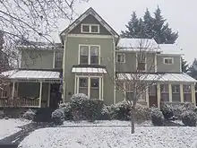 The house is two-story, four-square Late Victorian farmhouse. Although the architect of the Crossman House is unknown, it resembles the type of house that was available through mail-order catalogues in the late 19th century.[21] The house exhibits the characteristics of both the Queen Anne and Folk Victorian styles, including the asymmetrical plan, dominant front-facing gable and use of patterned wood shingles (now asphalt), weatherboards, and projecting bays. The house sits on a fieldstone foundation and has a cross-gable roof. It features an original wraparound front porch with turned posts and balusters.[22]