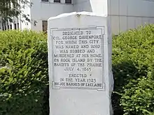 Colonel George Davenport, born George William King (1783 – July 4, 1845), was a 19th-century English-American sailor, frontiersman, fur trader, merchant, postmaster, US Army soldier, Indian agent, and city planner. A prominent and well-known settler in the Iowa Territory, he was one of the earliest settlers in Rock Island. He spent much of his life involved in the early settlement of the Mississippi Valley and the "Quad Cities". The present-day city of Davenport, Iowa is named after him.[1]