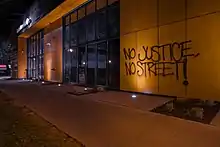 On May 26, 2020, the day after the murder of Floyd during his arrest, several videos by witnesses and security camera footage of the incident had circulated widely in the media, drawing substantial public scrutiny.[39][40] A makeshift memorial emerged at the East 38th Street and Chicago Avenue[41] and people gathered for the first organized protests.[42] Some protesters chanted, "I can't breathe, I can't breathe", words repeated multiple times by Floyd in the video captured of his murder.[43] Thousands of people soon flooded the intersection that same day.[44] By May 27, a group of protesters had blocked the intersection of East 38th Street and Chicago Avenue with a makeshift barrier as some repeated, "Whose streets? Our streets." Some people left memorials by the Cup Foods store, while some protesters spray painted the words "Justice for Floyd" and "Black Lives Matter" on the street surface. No police were present at the time and the protests there was described as peaceful.[45]