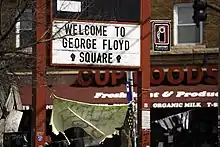 As a reaction to the murder of George Floyd on May 25, 2020, racial justice activists and some residents of the Powderhorn community in Minneapolis staged an occupation protest at the intersection of East 38th Street and Chicago Avenue with a blockade of the streetway lasting over a year.[7][8][9] The street intersection is where Derek Chauvin, a White police officer with the Minneapolis Police Department, murdered George Floyd, an unarmed 46-year-old Black man.[10] Activists erected barricades to block vehicular traffic and transformed the street intersection and surrounding structures with amenities, social services, and public art of Floyd and that of other racial justice themes.[2][4][9] The community referred to the unofficial memorial and protest zone at the street intersection as "George Floyd Square". The controversial[11] street occupation in 2020 and 2021 was described as an “autonomous” zone and a "no-go" place for police,[12] but local officials disputed the extent of such characterizations.[13][14]