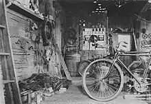 Foss returned to Sherbrooke at the age of 18 and opened up his own shop, offering machining, blacksmithing, and bicycle repair.[6] Foss’ first initiative was to engineer a 52-volt boat motor. This motor was mounted to the top of the rudder with a bicycle chain running to the propeller.[7] He made thirty small storage batteries, which were stored under the seat. The motor was very quiet and worked well for him, as he traversed the Magog and St Francis rivers.[7]