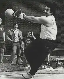 Frenn was also a good powerlifter, although he mostly approached that sport as training for hammer throwing; consequently, he concentrated on the squat and deadlift more than the bench press, as bench press was less good for his throws.[3] In 1967 he became the first national powerlifting champion in the 242 lb (110 kg) weight class despite the runners-up comfortably beating him in the bench press.[34] Frenn helped promote powerlifting and challenged the authority of Bob Hoffman in the sport;[35] with Joe Weider, Frenn organized one of the first international powerlifting meets, a competition between American and British lifters, in 1970 despite opposition from Hoffman.[3][35]