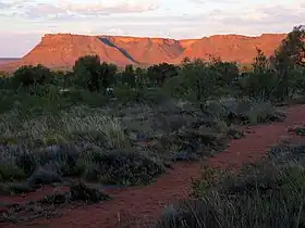 In the southern part of the range there are some springs and water holes. Among other things, the Kings Creek flows here, which at the western end created the Kings Canyon over millions of years. This canyon offers over 100 meter high rock walls in various colors, a permanently water-bearing billabong with lush vegetation and is surrounded by a plateau with spectacular stone formations. This natural beauty makes it one of the main tourist attractions in the region. About 36% of the range is located in Watarrka National Park.[1]