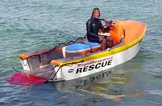 While tinkering with surfboard designs, Greenough also experimented in boat hull design. While living in California he redeveloped the American Boston Whaler hull to suit his particular needs, which included capsize resistance and open ocean mishandling flaws such as pearling and broaching. He designed a modified cathedral type hull and has used this design to build a number of beach-launchable and offshore fishing boats for himself for use both in America and Australia. He built a 15 foot version in Australia which he rigged with a camera boom for filming his movie Dolphin Glide. His hull design is an exceptionally good performer in the rugged surf experienced on the Australian coastline, and it allowed him to follow and film pods of Dolphins through the breaking surf without fear of mishap. His next development was an expanded jet-ski type watercraft which was intended as a Rescue Craft in the hopes the Surf Life Savers New South Wales (SLSNSW) would pick it up as a replacement for their current fleet of jet skis, but little interest was shown by the SLSNSW. He has since used this boat primarily for fishing the reefs offshore Eastern Austraiia. This ocean craft design, known as the GARC (Greenough Advanced Rescue Craft), was a product he developed to perform rescue missions in the breaking surfline and on the open ocean. The GARC is currently manufactured by MAPC (Maritime Applied Physics Corporation), which holds the patents for the craft.[14] This jet-ski look-alike is a more rugged and stable version that can be launched in the waves or by an aircraft. The development of the open transom and the stern tongue make it possible for rescues without having to actually lift the person in trouble out of the water. The GARC holds four people and will be used by the United States Navy, Coast Guard, and National Guard.
