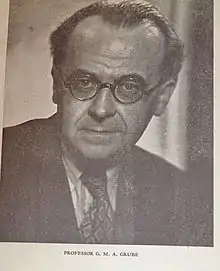 He moved to Canada in 1928, to begin his career as a professor of classics at the University of Trinity College in the University of Toronto.[5] He became the head of the classics department in 1931.[3] Grube was a socialist, and serving in World War I turned him into a passionate pacifist.[3] During his tenure at the UofT, he was involved in the Toronto branch of the League for Social Reconstruction (LSR), serving as president from 1934 to 1935.[3] When the LSR took control of the nearly bankrupt magazine, Canadian Forum, Grube became its editor from 1937 to 1941.[2] It was during his tenure at the magazine that it became the main media outlet for the LSR's publications.[6]