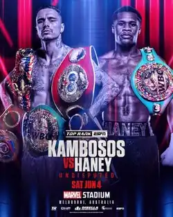 George Kambosos Jr vs Devin Haney, billed as Undisputed, was a lightweight unification professional boxing match contested between WBA (Super), IBF, WBO, and The Ring champion, George Kambosos Jr, and WBC champion, Devin Haney. The bout took place on 5 June 2022, at Docklands Stadium in Melbourne, Australia. Haney defeated Kambosos via unanimous decision to become the first undisputed lightweight champion since Pernell Whitaker in 1990, and the first in the four-belt era.[1][2][3][4]