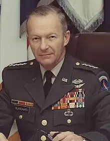 Blanchard's awards and decorations included the Army Distinguished Service Medal, the Silver Star, the Legion of Merit, the Distinguished Flying Cross, the Bronze Star Medal, the Air Medal, Army Aviator Badge, and Airborne badge. His military education included the Infantry Officer Advanced Course, Basic Airborne Course, Command and General Staff College and the Armed Forces Staff College. He retired in 1979.[1][2]