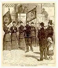 By 1880, Booth's son Bramwell Booth had matured and became his father's secretary. Railton, who since his youth had had a wish to be a missionary, persuaded Booth to send him to New York to begin the Army's work there. He was well suited to such work, being a skilled linguist, dedicated, and hard-working, and both he and his superiors felt more comfortable with him on the frontier than at headquarters. For example, at the celebration to mark the launch of the Salvation Army Assurance Society he sat on the platform barefoot and in sackcloth to register his disapproval of this worldly turn.[3] With male officers being few in number, Railton took Captain Emma Westbrook and six other young women with the intention of training them for the work on the voyage to the United States.[6]