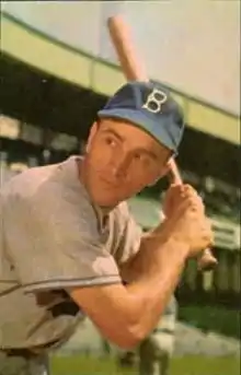 Shuba made his major league debut with the Dodgers on July 2, 1948. At the peak of his playing career, Shuba delivered a pinch-hit homer in the 1953 World Series opener, which the New York Yankees won 9–5. Ultimately, he worked up a career batting average of .259 on 211 hits in 814 trips, with 125 RBIs, 106 runs scored, and 45 doubles and 24 homers.[1] Playing for the Dodgers, Shuba watched as teammate Jackie Robinson won the league's MVP (1949).[2] A recent feature article noted that Shuba's "best year was in 1952 when he batted .305 (78-for-256) with nine homers, 40 RBIs and 40 runs scored".[1] Knee surgery, however, reduced his effectiveness after that season.[13] Shuba played his final game on September 25, 1955.[14] He appeared in the seventh and final game of that year's World Series; he pinch-hit for Don Zimmer in the sixth inning and grounded out for the final out. The Dodgers defeated the Yankees on Johnny Podres' 2–0 shutout for what would be the franchise's only World Championship in its Brooklyn history (the Dodgers would move to Los Angeles after the 1957 season).