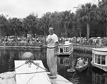 Esther Williams with George Sidney in glass bottom boat during filming of "Jupiter's Darling" at Silver Springs.