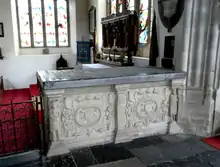 The chest tomb of George Slee survives in St Peter's Church, Tiverton. The sides of the chest tomb are decorated with strapwork panels, and Caryatids.[8] The thick marble ledger stone on top is deeply inscribed in Gothic lettering as follows:[9]