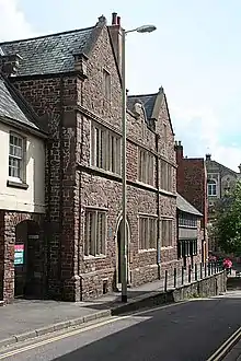 Slee's Almshouses were founded by George Slee in 1610 and were built posthumously in 1613 in accordance with the instructions in his will. He bequeathed £500 for the purpose and directed that they should be "for six poore aged woemen to dwell in". The women were to be aged at least "three score years", and were to be nominated by his wife Joan, and following her death by Churchwardens of St Peter's Church in Tiverton. The six women were to be "of honest name and fame" and for their maintenance received 12 pence per week payable on Saturdays. The Almshouses are described by Martin Dunsford (1744–1807) in his 1790 work Historical Memoirs of the Town and Parish of Tiverton.