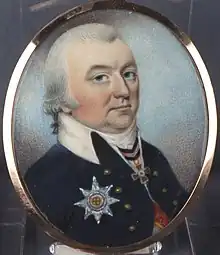 George, the third son, entered the Russian Navy, and in 1770 was made a lieutenant, probably in the fleet under John Elphinstone. He is said to have distinguished himself in several engagements against the Turks and the Swedes. At the capture of Ismail in December 1790 he was wounded. He was promoted to be rear-admiral and presented with a miniature of the empress Catharine II, set in diamonds. In 1795 he had a command in the squadron of twelve ships of the line sent, under Vice-admiral Hanikoff, to co-operate with the English; though they are said to have been in such a bad state that the English "derived no other advantage from them than the honour of repairing them and supplying their wants".[3] After a short experience of them, they were sent home as worse than useless. In 1796 and again in 1799 as vice-admiral, Tate commanded a squadron in the North Sea. He was made admiral and senator by Alexander I, and received the orders of St. Waldemar, Alexander Nevsky, and St. John.[2]