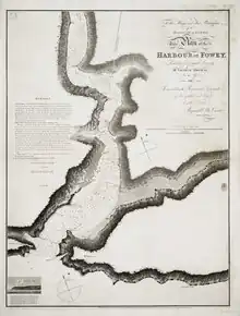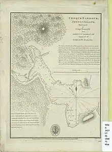 As Walker and Webb (2018) have pointed out, much of the above account is incompatible with contemporary records, in particular the date and place of the impressment. Also the Commerce was recorded as being captured by the Spanish at Pisco in Peru in May 1797.[5] Walker and Webb have reconstructed the events as far as possible from the official archives. They suggest that Thomas spent about five of the years since the capture of Commerce as mate of an American trading vessel. The Royal Navy ship that captured Harry and Jane in 1806 was HMS Medusa under the command of the Honourable Duncombe Pleydell Bouverie. Bouverie recognised Thomas's skill as a navigator, and quickly promoted him to midshipman then master's mate. Bouverie was himself an accomplished surveyor, and on return to England in 1807 published Sailing Directions for the Río de la Plata.[6] Medusa was then sent to Newfoundland in 1808, and Thomas conducted his first survey there, in Croque Harbour.[2] This would be published as Admiralty Chart No 278.[7]