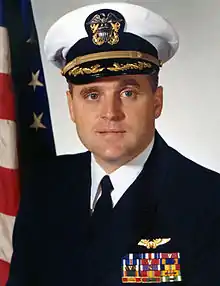 Coker was promoted to full lieutenant during his captivity and retroactively designated as a Naval Flight Officer (NFO), all NAOs having been redesignated as NFOs during his captivity.[36] Coker was awarded six decorations at a ceremony at NAS North Island in San Diego, California: Navy Cross, Silver Star, Legion of Merit, two Bronze Star Medals, and the Navy Commendation Medal. In 1974, Mayor John T. Gregorio presented him with a key to the city of Linden.[37] Coker was also awarded the Meritorious Service Medal for his "aggressive leadership" as Director of the Atlantic Fleet Command Center upon retiring from the navy in September 1986.[32][38]