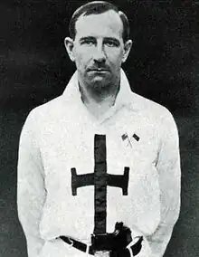 Christians posed for photographs with a form of crusader's cross or cross potent on a white shirt and a gun in his belt. More than one observer commented that with his toothbrush moustache he bore a resemblance to Adolf Hitler.[4][7] An inveterate letter writer in the cause of his "paper and ink revolution",[1] he sent twenty for every one he received,[6] on letterheads showing the Statue of Liberty, crossed American flags, and a torch with a red, white, and blue flame and in green and brown type.[15]