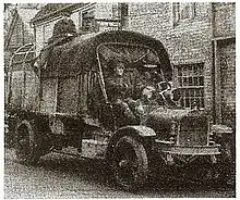 Three ton White Motors U.S. Army truck with Dayton Steel Wheels in a French village during World War I.