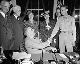 Senator James H. Hughes (D-del.); Mrs. Hughes; Mrs. Julia Welch Schwartz and Mr. George L. Schwartz, Welch's parents; and Lieutenant Welch shaking hands with President Roosevelt, 1942