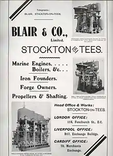 Blair's management led to the firm's specialising in marine engines. The 700 employees grew to 2 000, and the works covered seven and a half acres. Blair produced the first compound steam engine built on the Tees in January 1869 and fitted it to the Glenmore [3] built by Backhouse & Dixon. This was followed in 1884 by its first triple-expansion engine, fitted to the Burgos which had been built by Richardson, Duck and Company.