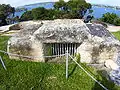On 10 March 1801 Governor Philip Gidley King informed the Secretary of State for Colonies that a battery was "in forwardness opposite the entrance to the Harbour, which will completely prevent attack from without". Despite that confidence, the job took another two years to finish. With only picks, crowbars, wedges and sledgehammers, a gun pit was cut out of solid sandstone, leaving a curved parapet 24-metre (80 ft) long on the cliff edge about 15 metres (50 ft) above sea level. There were two embrasures or gun openings, but guns could also be fired over the parapet. The guns – four twelve-pounders and two six-pounders – were landed at Obelisk Beach (then known as Georges Beach) and hauled up through the bush. Also in the gun pit was built a magazine for powder and shot, with stone walls three feet thick.[5] The Sydney Gazette reported on 23 October 1803 that "The new battery is compleated and the artificers and labourers recalled ... the battery mounts six guns, two long twelves [12 pounders] on the right, two of the same size on the left and two short sixes in the centre. The first of these command the bay inwardly, those on the left command the entrance of the harbour between the heads and those in the centre point across the channel."[6]