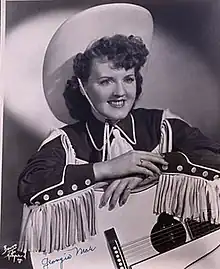 Later she had a weekly Saturday television show on WBZ-TV and was DJ for "Korn's a-Krackin" on WRKO (AM) (then WLAW). She also toured throughout New England and parts of Canada, playing her iconic customized white Vega guitar,[2] demonstrating her virtuoso triple yodel,[3] and sporting her elaborate outfits made by "Rodeo Ben" Lichtenstein.[2] Although she played with backing musicians on radio and recordings, her live appearances were solo shows.[2] During World War II, Georgia Mae entertained at veteran's hospitals and at war bond drives.[4]