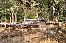 The walking woodland trails have benches scattered about so that people can sit and rest while enjoying the birds and other wildlife that live within the gardens. On one woodland trail is the Kennedy Outdoor Classroom with a small raised stage and benches that is used for some botanical garden presentations.