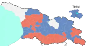 The elections were held in accordance with a reformed electoral system agreed upon by the government and several opposition parties in 2011.[3] 77 of the 150 seats were allocated proportionally to party lists, the remaining 73 to the winners in single-member constituencies.[4] The new parliament was relocated from the capital of Tbilisi to the country's second largest city of Kutaisi later, in 2012.[3] A new government was also formed following the 2013 presidential election as envisaged by the 2010 constitutional amendments.[5] South Ossetia and Abkhazia did not vote.