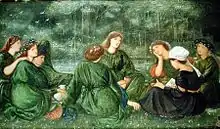 Green Summer, a watercolour by Burne-Jones painted at Red House in the summer of 1864 while Georgiana's sisters Louisa and Agnes were visiting London, depicts Louisa, Agnes, Jane Morris, and others listening to Georgiana reading aloud.[43] A version in oils was painted in 1868.
