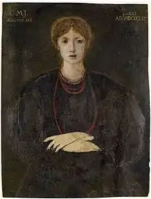 Georgiana Burne-Jones, in common with others of her circle, is portrayed in a number of drawings and paintings by her husband and other artists. A portrait by her husband, dated 1863 and now in the Birmingham Museum and Art Gallery portrays the 22-year-old Georgiana in a format heavily influenced by Renaissance portraiture, including the Latin inscription. It is one of Burne-Jones's first attempts at formal portraiture.[42]
