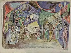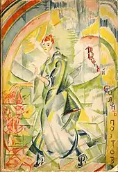 In 1908[15] he made a trip to Italy (visiting Venice, Padua, Florence, Siena and Rome),[17] in 1911-1913 he spent a long time in Paris (where he met and communicated with R. Delaunay),[18][19] in 1913 he took part in the Autumn salon "Storm" in Berlin.[20] In 1913, Yakulov, together with the blue-rozovites Saryan and N. Milioti, illustrated the book of poems "Purple Kifera"[21] V. Elsner, with Sudeikin created the scenery for the theatrical program "Dog Carousel" in the artistic cabaret "Stray Dog" in St. Petersburg.[7]