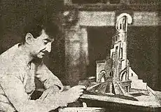 Simultaneously and in parallel with theatrical and decorative creativity, Yakulov was able to step into the design and construction (architectural) sphere: in 1922 on the instructions of the head of the Sportintern N. Podvoisky, he participated in the preparation of the "Red Stadium" project in Luzhniki,[83] in 1923–1924, in collaboration with V. Schuko, he created a project of a monument to 26 Baku commissars.[84][85] Yakulov considered the design of the "26 monument" to be his major work: "This work completes a cycle of works throughout my entire artistic activity to create a work of heroic pathos".[86]