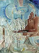 At the end of December 1913, at meetings in Stray Dog, a controversy arose about the priority of ideas, put forward by R. Delaunay in his theory of "simultanism-orphism" - after the report of the philologist A. Smirnov, who promulgated the concept of Delaunay, Yakulov protested against the appropriation of ideas from his own theory, which a week later, on December 30, he stated in his report: "Natural light (archaic solar), artificial light (modern electric)".[22][18] On January 1, 1914, together with the "Budelians" A. Lurie and B. Livshits, he wrote the manifesto "We and the West", released shortly in three languages (Russian, French and Italian) and then reprinted by G. Apollinaire in the Mercure de France.[23][24] Years later, Livshits briefly but eloquently described the co-author of this manifesto: "Unlike most painters, Yakulov had the gift of generalization and knew how to coherently express his thoughts".[25]