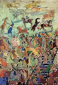 The very first work "Horse Racing", created by Georgy Yakulov upon his return to Moscow and shown by him in 1906 at the exhibition "Moscow associations of artists", attracted attention in art circles[8] and was noted by Pavel Muratov in the magazine "Vesy": "The paradoxical drawing" Horse Racing "by G. Yakulov is carried out sharply, the artist interestingly applied the colored spots of chinese vases to his theme".[9] A strong impression on contemporaries was made by bright entertainment and organicity, with which Yakulov connected in this work the traditions of the East with the aesthetics of late modernism, and when, in 1908, Kazimir Malevich showed his flat gouaches with an entertaining crowd, they were perceived as an imitation of Yakulov.[10]