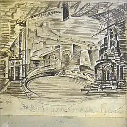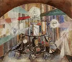 Theatrical works fully revealed the synthetic character of Yakulov's work. A one-of-a-kind combination of constructivism with decorativeism,[140] wild imagination and practical ingenuity,[141] innovative searches and striving to preserve the generic specificity of theatrical art,[142] wide intellectual outlook and lively reaction to the latest events in life and art - all this acquired an organic whole in the scenography of the outstanding theater artist.[61]