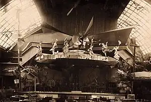 Models of the monument to 26 Baku commissars and theatrical scenery Yakulov participated in the World Exhibition in Paris (1925).[95][96] Prior to that, in October 1922, five of his paintings were presented at the 1st Russian exhibition at the Van Diemen & Co gallery in Berlin, and in March 1923, while on tour of the Chamber Theater in Paris,[97] he exhibited at the local gallery "Guillaume".[98] Yakulov was a member of the selection committee of the Soviet section at the preparatory stage for the World Exhibition,[99][100] and during her work he was elected vice-president and member of the jury for the Theater section, as well as a jury member for the Architecture Section[101] (these international sections were housed in the Grand Palais).[102] Yakulov's works, as a member of the international jury, did not participate in the competition, they were awarded Honorary Diplomas (the second most important award after the Grand Prix) out of competition.[103][92]